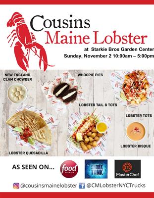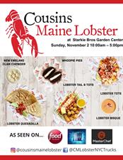 Cousins Maine Lobster is stopping at Starkie Bros Garden Center for the day of November 2nd, from 10am-5pm