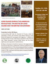 Bill Bleyer will present a PowerPoint Lecture on the largest battle of the American Revolution, a defeat that could have spelled the end of the Continental Army in 1776, and the subsequent British occupation and hardships it caused for Long Island residents until the end of the conflict in 1783. Long Island was the last place occupied by the British during the Revolution.