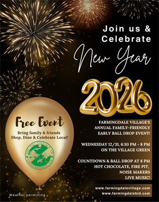 Farmingdale Village is hosting an Early, FAMILY FRIENDLY NEW YEAR'S EVE CELEBRATION - Ring in 2026 with a New Year’s Eve 8 pm Ball Lighting/Ball Drop with live music - free admission, free hot cocoa, free noisemakers ... on the Village Green, 361 Main St, weather permitting. Bring family & friends - all ages: Wednesday eve, 12/31/25, free celebration from 6:30-8 pm with Live music by Farmingdale's Electric Dudes @ the gazebo. The festivities conclude with the countdown & NYE ball lighting @ 8 pm. Dine & celebrate locally throughout the Village before & after the festivities. Thanks to the Farmingdale Business Improvement District, Farmingdale Village Fire Department, Farmingdale Chamber of Commerce & Farmingdale Village Board.